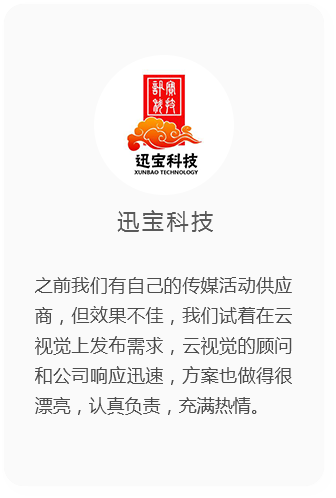 云視覺匯集海量傳媒公司和傳媒行業(yè)大咖,采用自主研發(fā)的CRM管理系統(tǒng),通過大數(shù)據(jù)方式篩選優(yōu)秀的活動服務(wù)商,是您找傳媒公司、找傳媒藝人的高效可靠途徑。